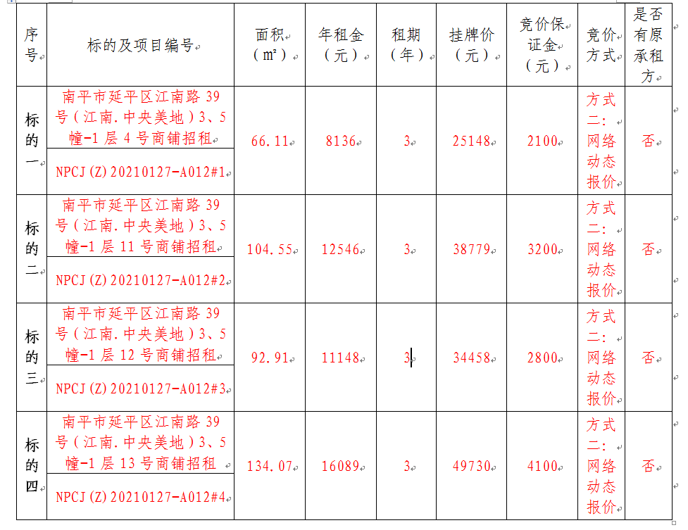 租賃標(biāo)的名稱 | 南平市延平區(qū)江南路39號(hào)(江南.中央美地)3、5幢-1層4號(hào)商鋪,南平市延平區(qū)江南路39號(hào)(江南.中央美地)3、5幢-1層11號(hào)商鋪,南平市延平區(qū)江南路39號(hào)(江南.中央美地)3、5幢-1層12號(hào)商鋪,南平市延平區(qū)江南路39號(hào)(江南.中央美地)3、5幢-1層13號(hào)商鋪招租 | | |||||||||||||||||