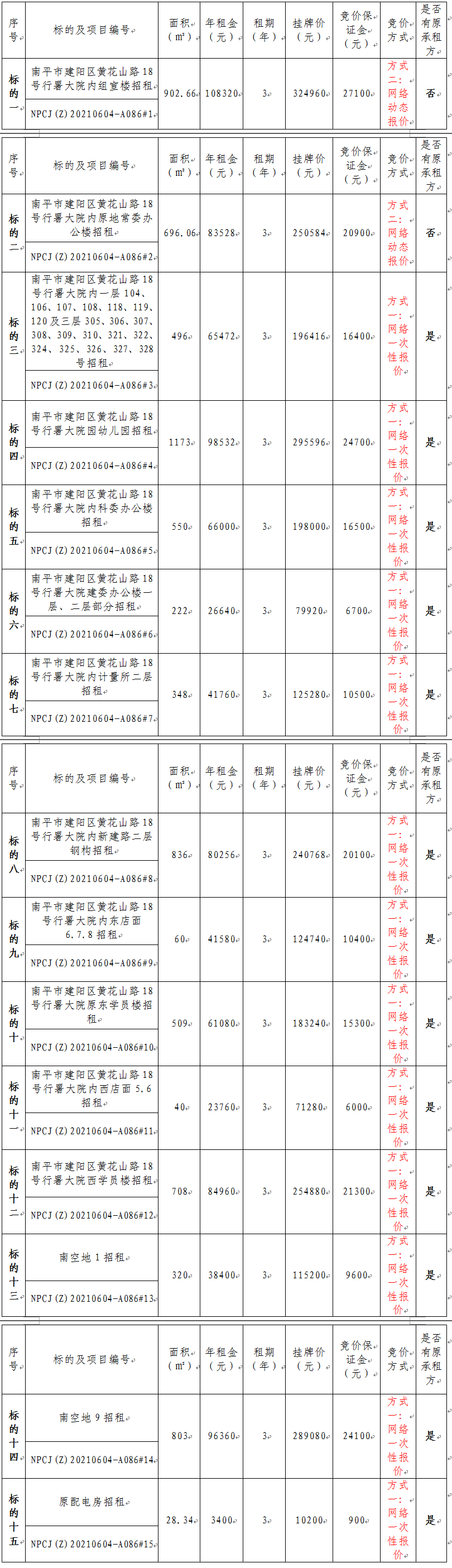 南平市建陽區(qū)黃花山路18號(hào)行署大院內(nèi)組宣樓,南平市建陽區(qū)黃花山路18號(hào)行署大院內(nèi)原地常委辦公樓, 南平市建陽區(qū)黃花山路18號(hào)行署大院內(nèi)一層104、106、107、108、118、119、120及三層305、306、307、308、309、310、321、322、324、325、326、327、328號(hào),南平市建陽區(qū)黃花山路18號(hào)行署大院園幼兒園,南平市建陽區(qū)黃花山路18號(hào)行署大院內(nèi)科委辦公樓等15處房產(chǎn)招租 |