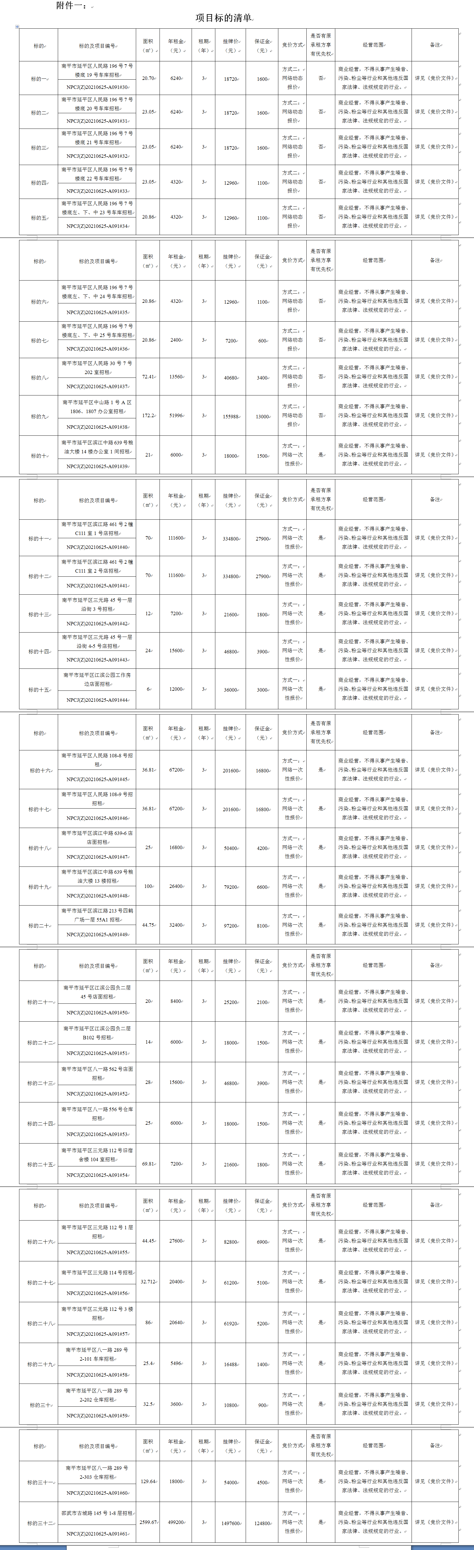 1.租賃用途:詳見(jiàn)附件一。 2.于競(jìng)買(mǎi)人計(jì)算面積單價(jià),網(wǎng)絡(luò)競(jìng)價(jià)以年租金底價(jià)進(jìn)行報(bào)價(jià),最終成交總額以年租金的最高報(bào)價(jià)×租賃期限。 3.本次競(jìng)價(jià)標(biāo)的十至標(biāo)的三十二屬在同等條件下原承租方享有優(yōu)先承租權(quán)。 4.裝修情況:以實(shí)際現(xiàn)場(chǎng)看樣為準(zhǔn)。 5.原租賃合同到期日: 5.1租賃標(biāo)的標(biāo)的十至標(biāo)的十五、標(biāo)的二十五至標(biāo)的二十七及標(biāo)的二十九至三十原租賃合同于2021年5月31日到期; 5.2租賃標(biāo)的十六至標(biāo)的二十四及標(biāo)的三十二原租賃合同于2021年6月30日到期; 5.3租賃標(biāo)的三十一原租賃合同于2021年6月19日到期; 5.4租賃標(biāo)的二十八原租賃合同于2021年4月30日到期。 6.起租時(shí)間:若原承租人未報(bào)名參加競(jìng)租或報(bào)名參加競(jìng)租未取得標(biāo)的,原承租人應(yīng)于原租賃合同到期次日起7天內(nèi)將承租房產(chǎn)退還出租方,若原承租人報(bào)名參加競(jìng)租取得標(biāo)的的,起租時(shí)間自成交公示期滿(mǎn)次日起計(jì)算(若原合同期限未到期的新合同自然延順);新承租人起租時(shí)間自出租方通知接收房產(chǎn)之日起計(jì)算。 7.具體事項(xiàng)以與出租方簽訂《房屋租賃合同》為準(zhǔn)。提示:以上標(biāo)的概況由出租方提供披露,具體項(xiàng)目標(biāo)的狀況以現(xiàn)場(chǎng)看樣和相關(guān)文件的數(shù)據(jù)為準(zhǔn)。 |